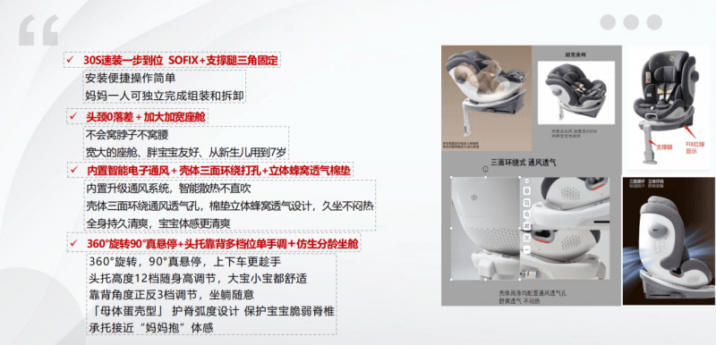 在生产与检测环节,好孩子以远超行业标准的严苛要求把控每一款安全座椅的品质,通过数以万计的碰撞测试与仿真分析,不断突破安全防护极限。以高速汽车安全座为例,其研发过程中不仅完成了 94.7Km/h 的实车对撞试验,还集结 75 名欧美中日专家,处理 1.2TB 数据量,完成 3698 次深度分析,将碰撞瞬间速度提升至 80km/h(相当于从 25 米高空坠落的碰撞速度),用极致测试确保产品在极端场景下的安全性能。同时,好孩子儿童安全座椅多次斩获世界级工业设计大奖,包括中国优秀工业设计金奖 2 项、iF 设计大奖 8 项(含金奖 1 项)、中国专利金奖 2 项、G-mark 奖 10 项、红点设计大奖 50 项(含至尊奖 3 项)及美国 IDA 设计奖 5 项,实现安全与美学的完美融合。