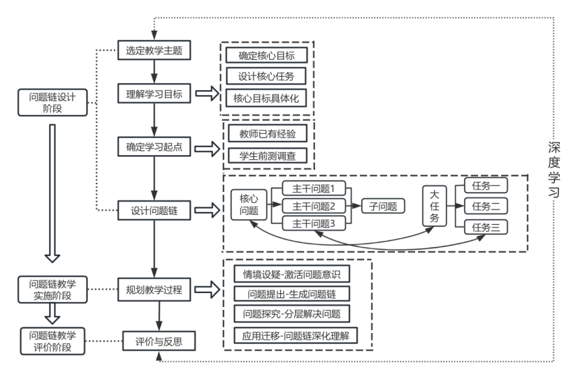 在问题链理论模型和现实模型的指引下设计教学流程,让问题链教学更具有操作性和可迁移性。借助詹森等的深度学习过程模式,结合单元设计模型,从预备、实施、评价这三个阶段搭建指向高阶思维发展的问题链教学流程。