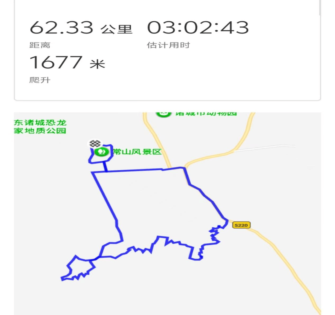 路线串联:常山文博苑广场 → 平日路 → 皇华镇 → 平日路 → 凤凰山 → 三块石 → 茁山齐长城 → 石人山 → 马耳山 → 郝戈庄 → 常山文博苑广场,全程约62公里,爬升1677米。