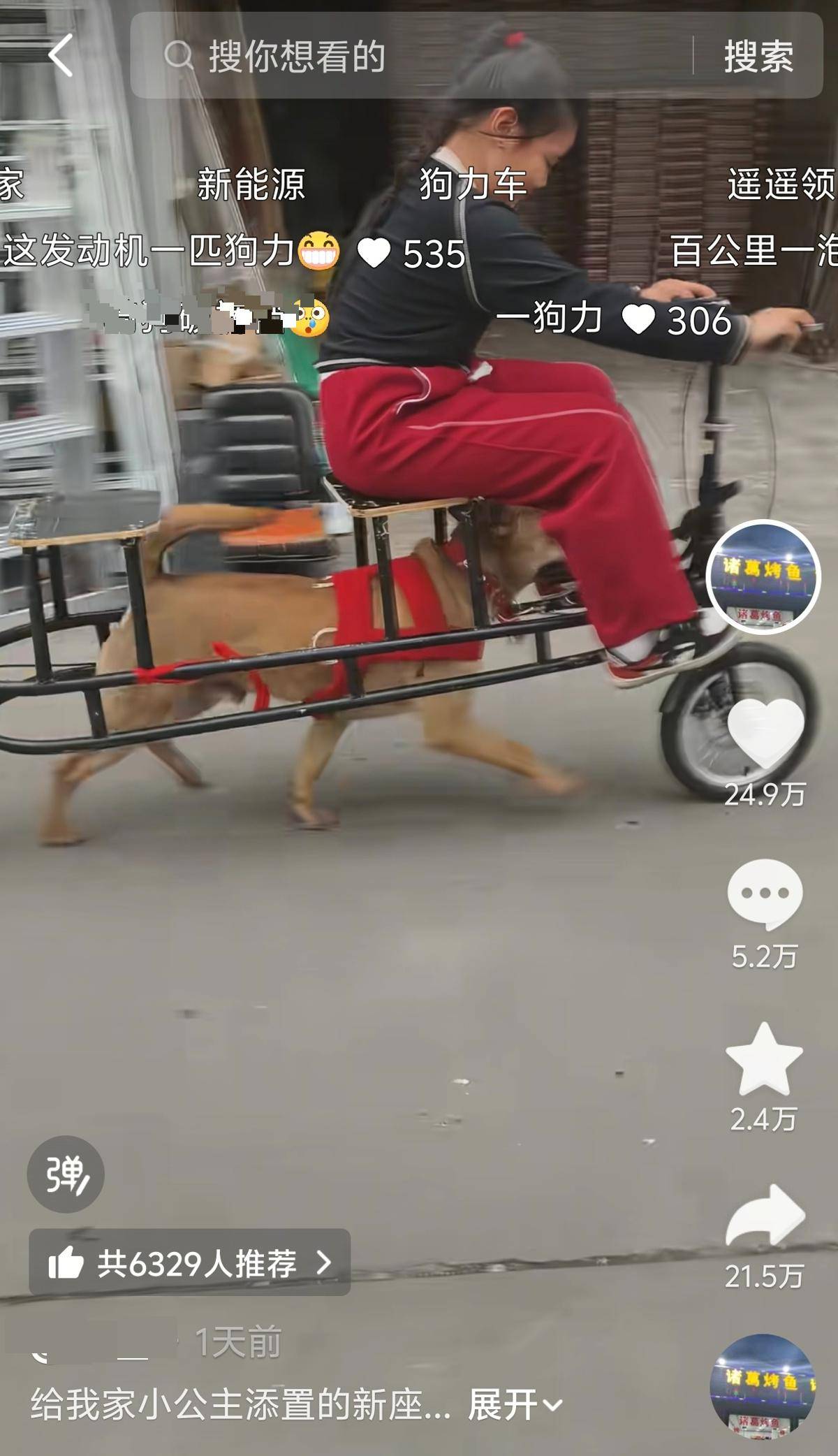 网友发布的视频画面中,一辆加长版的自行车上有前、中、后三个座位,前后两个车轮之间则加装了一个立体车架,狗狗被套上红色背带,在车架下奔跑。一位小女孩扶着车把坐在前座上,随着狗狗向前奔跑,自行车也随之前进。视频配文称:“给我家小公主添置的新座驾。”