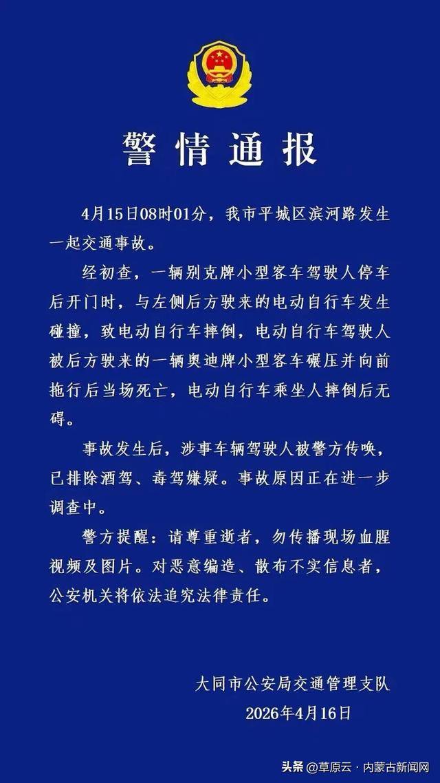 此前据二三里资讯报道,4月15日上午8点左右,山西省大同市平城区滨河路发生一起因“开门杀”引发的致命交通事故,事故致一名男性死亡,其同车另一人受伤。目前,涉事的两名司机已被警方传唤,涉案车辆被扣留。
